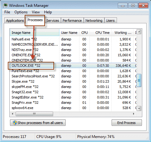 A na karcie Proces idź dalej, a następnie poszukaj pliku Outlook.exe, a następnie wybierz go.