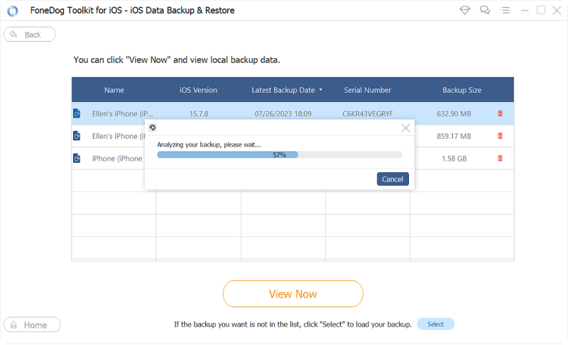 Po kliknięciu przycisku Wyświetl teraz, FoneDog iOS Data Backup and Restore rozpocznie skanowanie pliku kopii zapasowej, który wybrałeś. Od tego momentu wszystko, co musisz zrobić, to poczekać na zakończenie procesu. Tutaj masz opcję Wstrzymaj proces skanowania lub Zatrzymaj go, aby natychmiast zakończyć skanowanie.