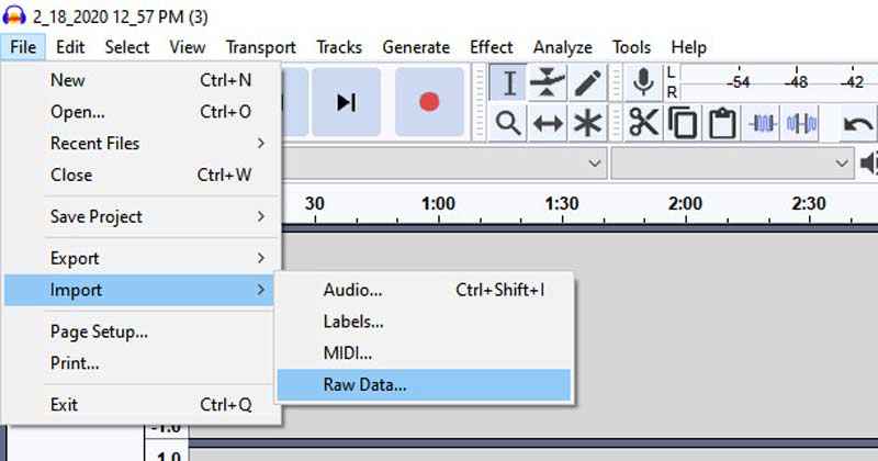 Krok 2. Natychmiast uruchom Audacity na komputerze, kliknij Plik w lewym górnym menu, wybierz Importuj i wybierz Surowe dane. Następnie zlokalizuj plik AUD wyeksportowany na komputerze, aby go wybrać i otworzyć.
