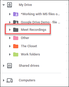 #6. Dostęp do nagranego materiału: Po zakończeniu spotkania nagranie zostanie poddane obróbce i zapisane. Dostęp do niego uzyskasz poprzez Dysk Google lub nawet aplikację Google Meet. Więc gdzie przechowywane są nagrania Google Meet? Zazwyczaj nagranie będzie przechowywane w formacie „Poznaj nagrania” folder na Dysku Google.